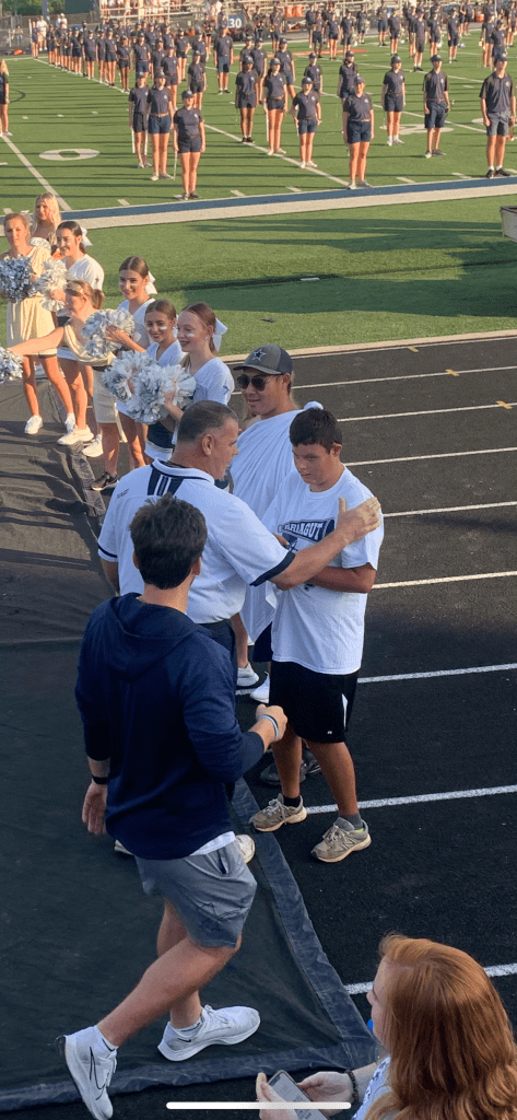 He so rose to the occasion. He was loving every minute of it. He loved wearing his cheer shirt. He loved the football players running by. Oh! And this moment….