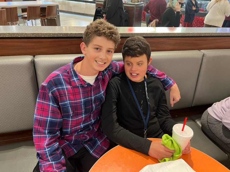 Caleb has always been super connective and social. For many years, I was involved in his relationships. I had to translate or coach. Not anymore. He has so many friends that are his only. And they love him so much. They have come right alongside. They love spending time with him. And they now translate and coach too. What a blessing these sweet friends have been. A few weeks before Christmas I got to go on a field trip with Caleb to the mall. He had peer tutors that stayed with him the whole time. They were so above and beyond. So sweet. So encouraging. Caleb wanted to sit on Santa’s lap but he was too terrified. Those friends would not stop until it happened. We would get so close then Caleb would scream and run by as fast as he could. His friends never got frustrated. And they never gave up. Honestly, I would have. I didn’t think there was a chance in the world that he would do it. Boy was I wrong.