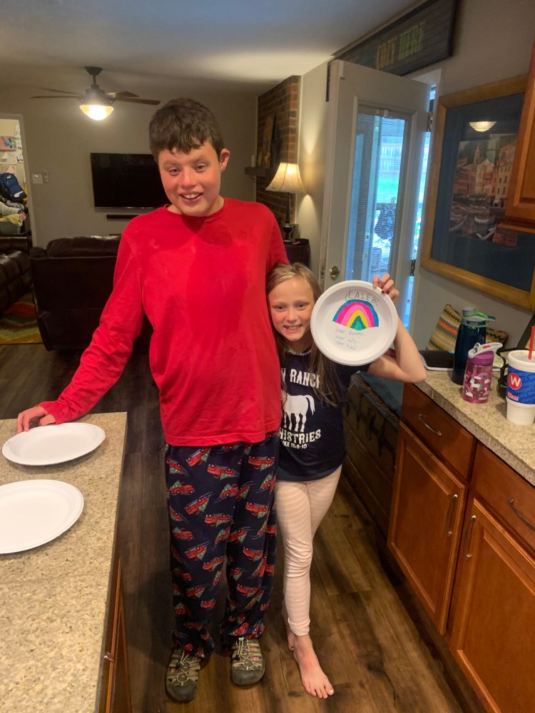 Cheyenne needs purpose in her life. She will “play” but it doesn’t keep her interest for long. The current exception to this is her recent birthday present from her grandparents, a re-born baby. Have you seen these things?! It looks so real! We get a lot of comments when we are out about it! It makes the sweetest little cooing sounds and has a heartbeat. Her dad and brothers think it is super creepy. But she and Alexa love it and I have to say I think it is pretty cool too! (I might pat its bottom when I “babysit”…. why do us mamas have to do that to babies?!) As much as she loves Leia (the reborn baby), she would much rather do something that makes some kind of difference. When Collin and Alexa will cooperate she loves to do school with them and actually teach them. She can spend hours doing some type of activity/therapy with Caleb. Just last night she found this little zipper bag and decided it would be Caleb’s mailbag. (He LOVES playing mailman and even was a mailman for Halloween one year with a real mailman’s uniform and mailbag…. our mailman loaned it to him!) She had him sit at the craft table and make cards for members of our family. Then she had him put all the cards in the “mailbag” one at a time and they would run around the house yelling “Mail delivery! Mail delivery!” They both had the best time.